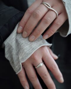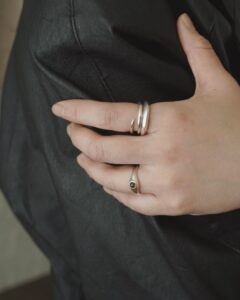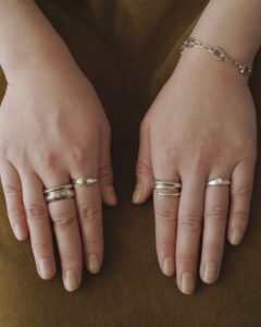 最初にリングをひとつ迎え、次の受注会ではそれに合うアクセサリーを新調して重ね付け。